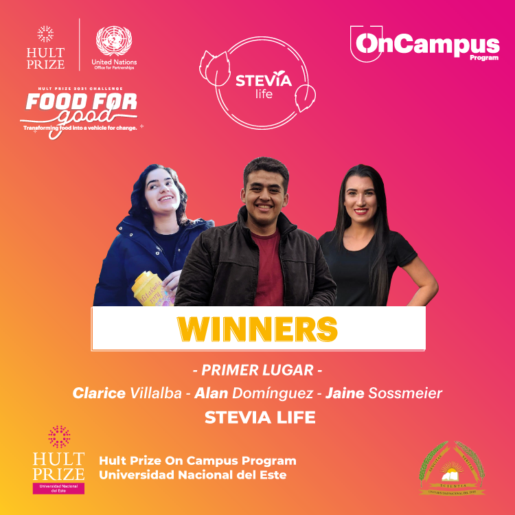 Stevia Life, compuesto por Alan Domínguez, Jaine Sossmeier y Clarice Villalba, se consagraron ganadores de la edición 2020/21 del Programa On Campus de Hult Prize en la UNE.